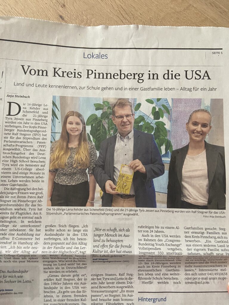 Am 31.01.2023 stand ich, noch innerlich gestresst von der mündlichen Prüfung, mit zitternden Händen vor dem Abgeordnetenbüro von Herrn Dr. Ralf Stegner. Typisch für mich schlug mir das Herz mal wieder bis zum Hals. Hier kann ich aber wirklich die Angst nehmen. Das Gespräch handelte im allgemeinen von meiner Motivation am Programm teilzunehmen, kulturellen Unterschieden zwischen den USA und Deutschland und meiner Rolle als Juniorbotschafterin. Am Ende bewertete ich kurz noch aus meiner Sicht das derzeitige hot topic der Politik.