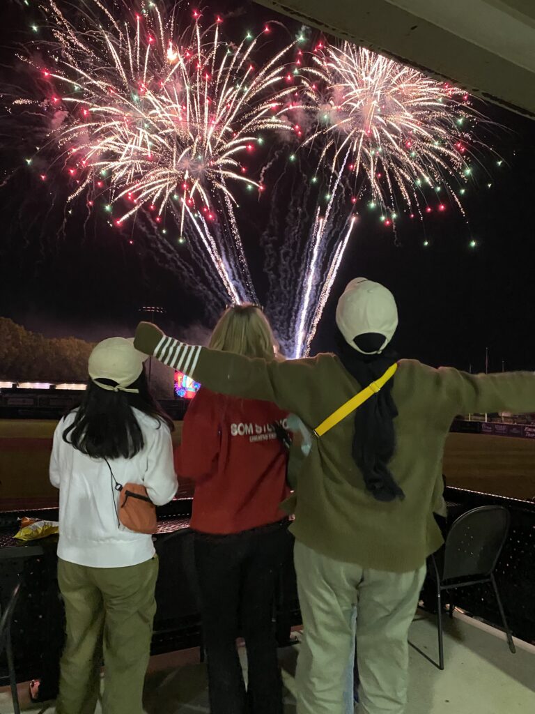 Dann waren alle internationals vom College zusammen beim Baseball Game. Trotz dessen, dass ich die Spielregeln nicht kannte, war es ein gelungener Abend. In der Mitte des Spiels flog plötzlich ein Baseball durch die Menge auf den Kopf einer Besucherin. Der Schock saß erstmal tief und es kamen direkt Sanitäter. Nach dem Vorfall ließ ich den Ball keinen Moment aus den Augen. In der Pause wurde uns kostenloses Essen angeboten, welches wir bei schönstem Sonnenuntergang genossen. Am Ende gab es noch ein wunderschönes Feuerwerk. Nach dem Spiel nutzten viele Kinder die Gelegenheit, über das Spielfeld zu laufen. Das ließen auch wir uns nicht entgehen. Gemeinsam mit den Kleinen rannten wir also über das Spielfeld. Man ist nur einmal jung!!